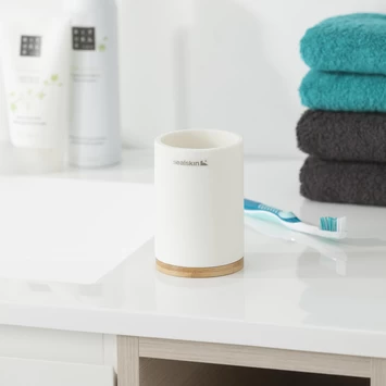 De Sealskin Beker Grace Wit is gemaakt uit steen. De afwerking is een combinatie van wit steen en bamboe accenten. Ideaal om een vakantiesfeer te creëren in je badkamer. De beker is eenvoudig te reinigen met een vochtige doek. Vervolledig deze Grace serie van Sealskin met de bijhorende zeepdispenser, toiletborstel met houder, tandenborstelhouder en spiegeldoosje.