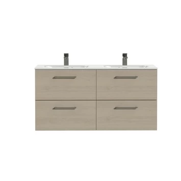 Door het strakke en tijdloze design past dit Tiger Studio badkamermeubel in iedere badkamer. Deze wastafelonderkast heeft 2 ruime lades om alle badkamerspullen overzichtelijk in op te bergen. De lades zijn uitgerust met hoogwaardige ‘soft close’ geleiders waardoor ze geruisloos sluiten. De warme houttint geeft een sfeervol karakter aan het meubel. Daarnaast krijgt het meubel, door de voelbare houtnerf, een mooie natuurlijke uitstraling. De mooie, wit glanzende polybeton wastafel met ovale waskommen en rvs grepen maken deze set compleet.