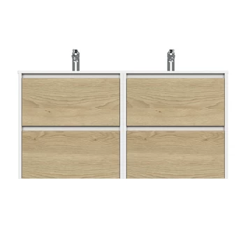 Breng karakter naar de badkamer met de nieuwe Tiger Reverse serie. Reverse is het elegante antwoord op de industriële badkamertrend. Gedurfde lijnen zorgen voor een opvallende, stoere look. De subtiele zijpanelen in wit en de afwerking in naturel eik brengen een stijlvolle sfeer naar je ruimte. Deze greeploze wastafelonderkast is een combinatie van 2 onderkasten van 60 cm met in totaal 4 softclose lades. Perfect voor het opbergen van je badkamer essentials.